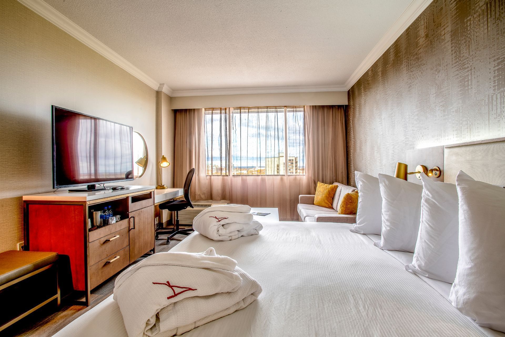 Traditional accommodation with 2 Queen beds, located on floors 2 to 7, 55 inch LG Smart TV’s, spacious work station, mini fridge, free Wi-Fi, two complimentary bottles of water.
